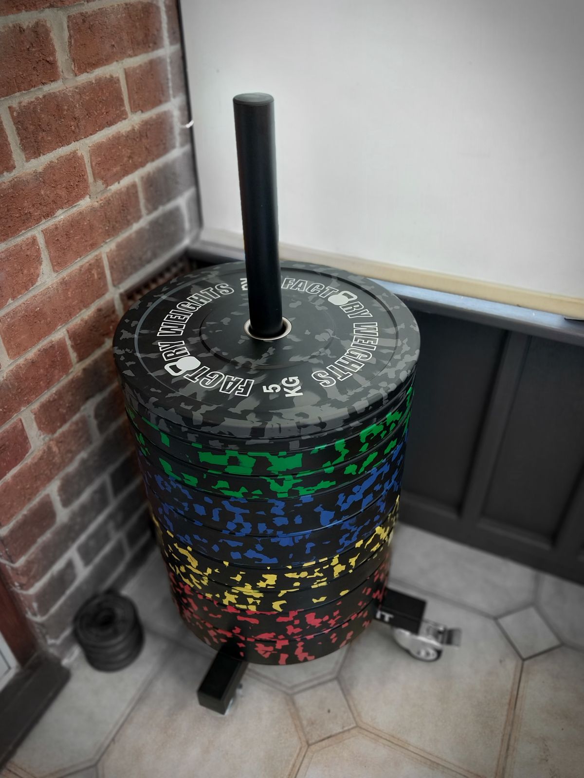 I recommend getting some quick release collars, and some kind of storage device since those heavier bumper plates get pretty chunky.