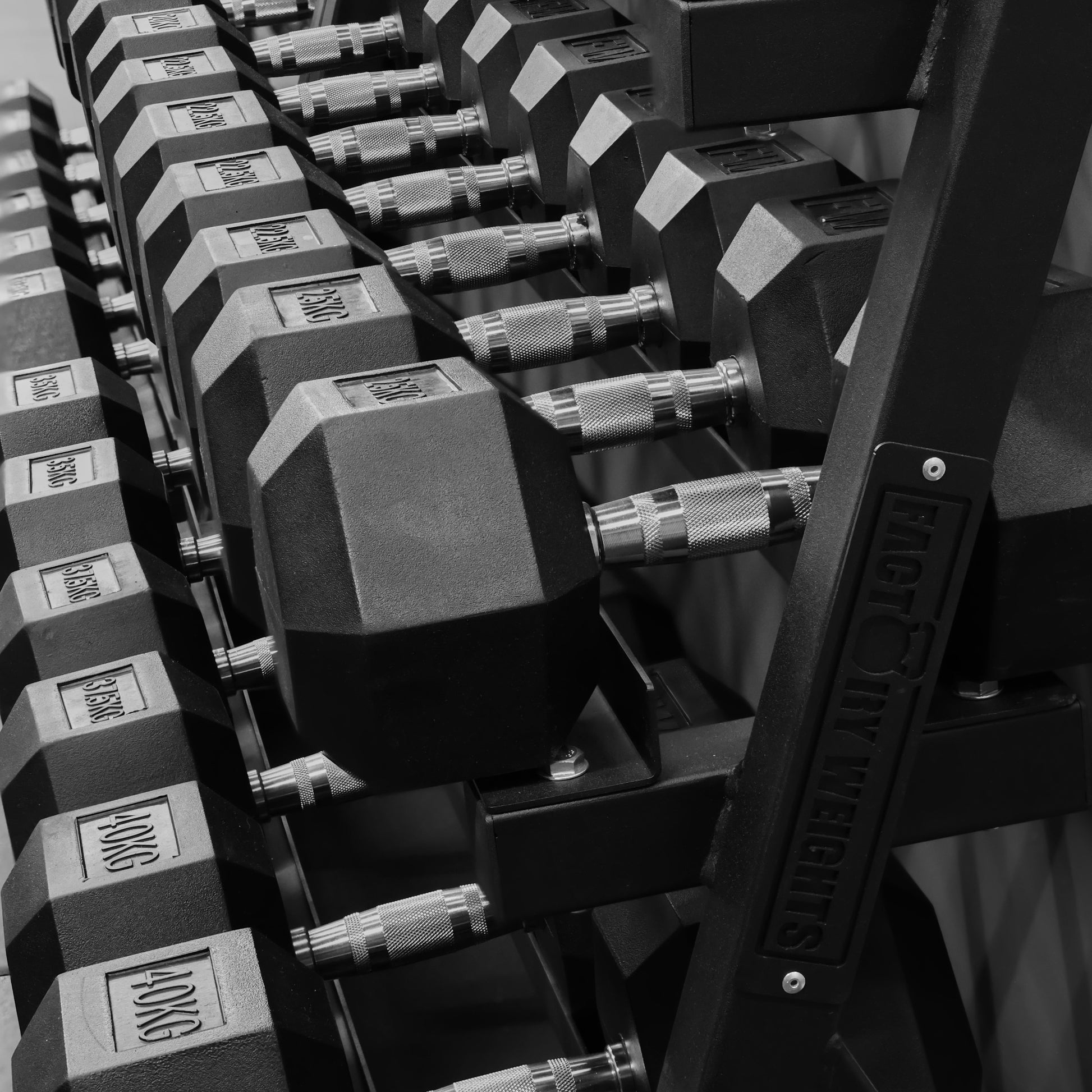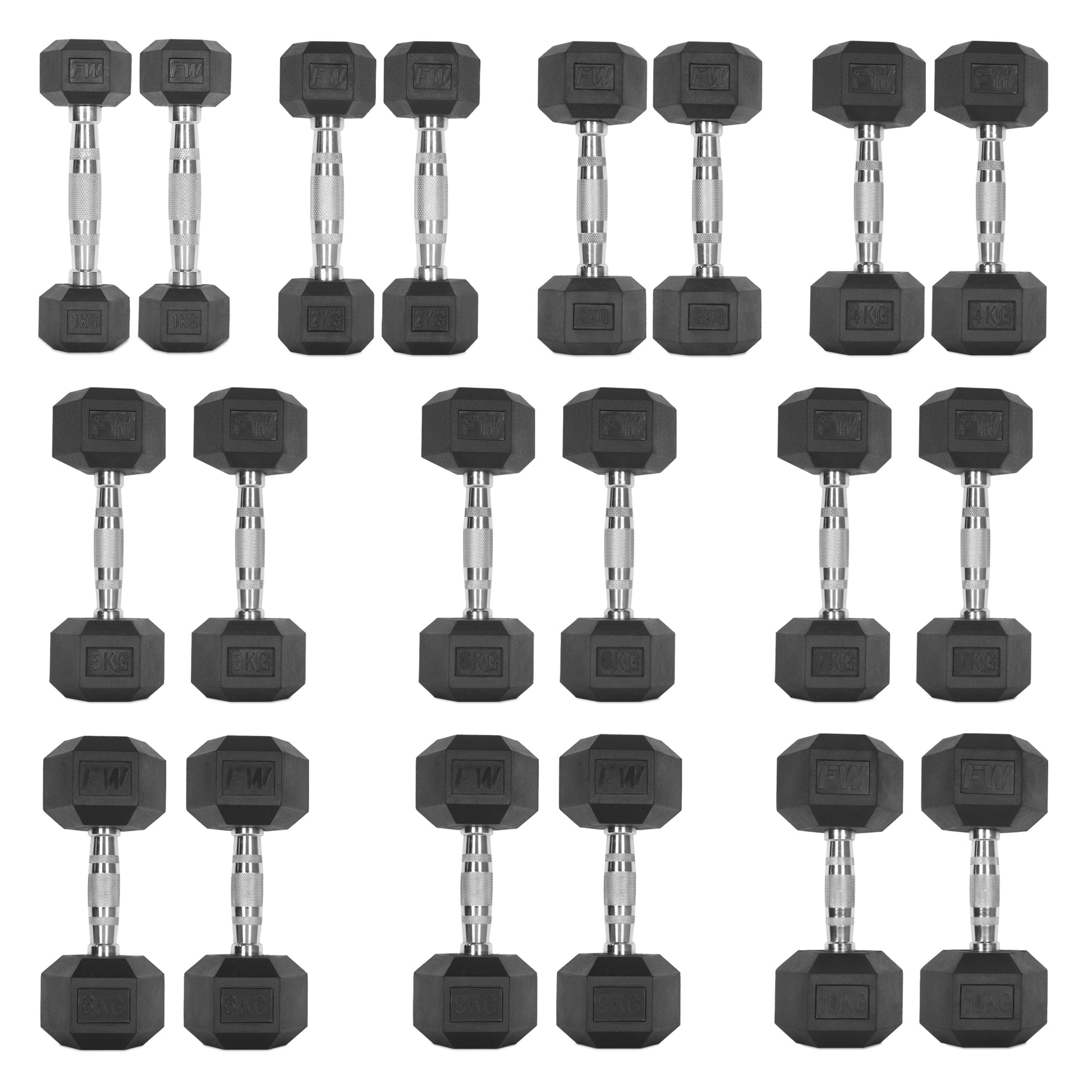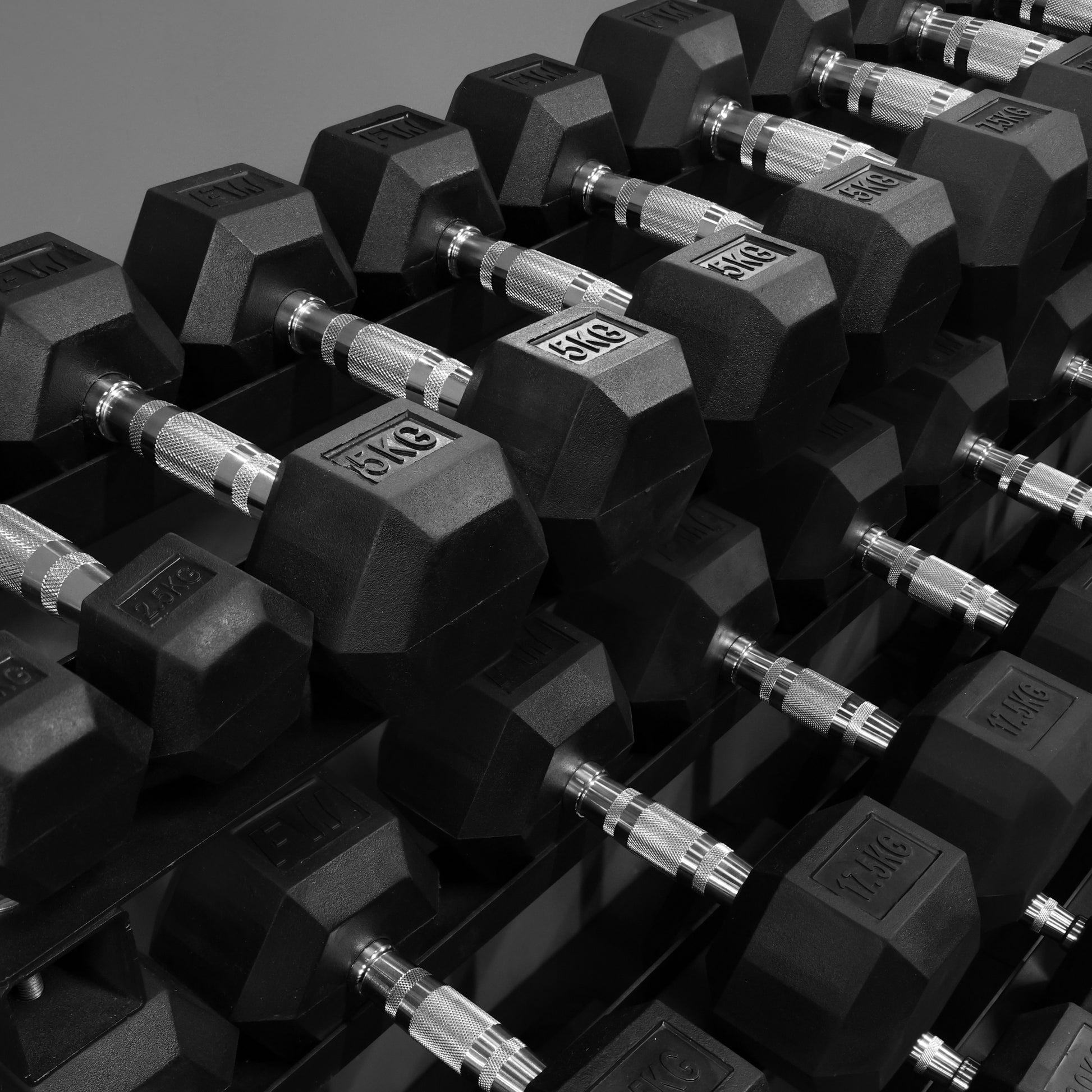 Our Rubber Hex Dumbbells are perfect for working all muscle groups to build strength, size and definition. They feature knurled steel grips for a secure hold. The protective, rubberised end is designed for durability and protection. The hexagonal ends have been shaped to stop weights from rolling.