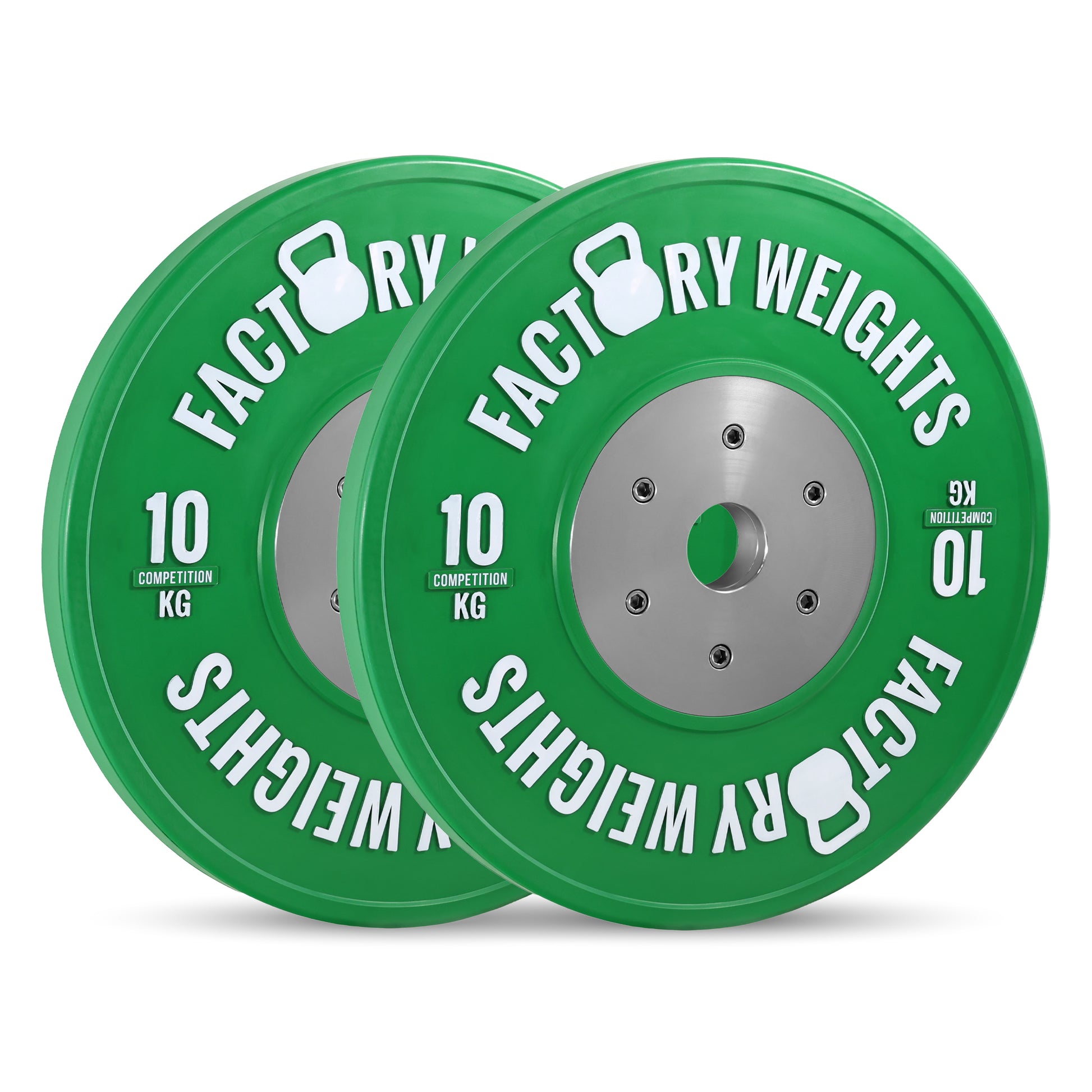 Factory Weights Competition Olympic Bumper Plates are designed to the specifications required by the International Weightlifting Federation for weightlifting competition. The plates feature a matt rubber finish with raised logos and weight markings for easy identification. All the plates are 45cm in diameter and feature a steel disc insert for superior calibration and a dead bounce when dropped. The collar opening on the plates is 50.4mm for a stable fit on the bar. The weight tolerance for each plate is an industry leading +/- 10g.