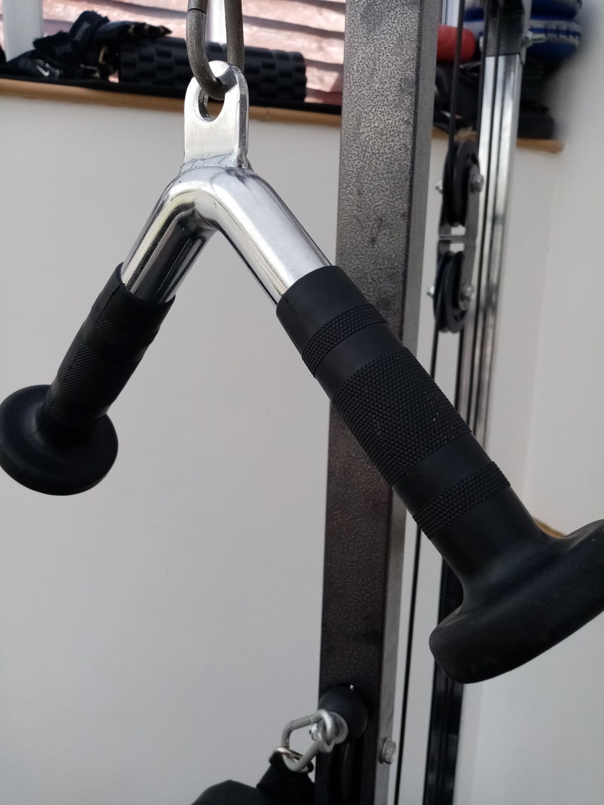 Our first generation V-bar pushdown cable attachment is compatible with all carabiner clips, pulley systems and cable attachments. The product is manufactured with high quality steel. Thick rubber grips ensures a comfortable and fully supported position when performing the movement. This is the perfect addition when looking to target and isolate the triceps.
