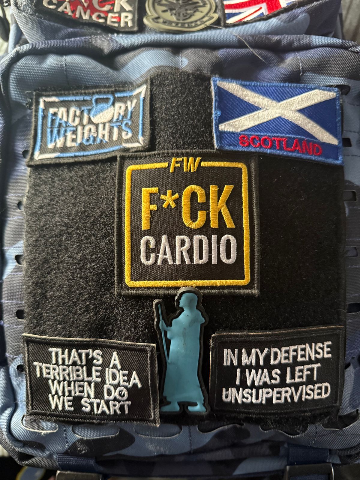 Love lifting, hate cardio? Our top selling patch says you're not alone! Hook velcro Fabric backing to connect to tactical back pack or other loop velcro products.