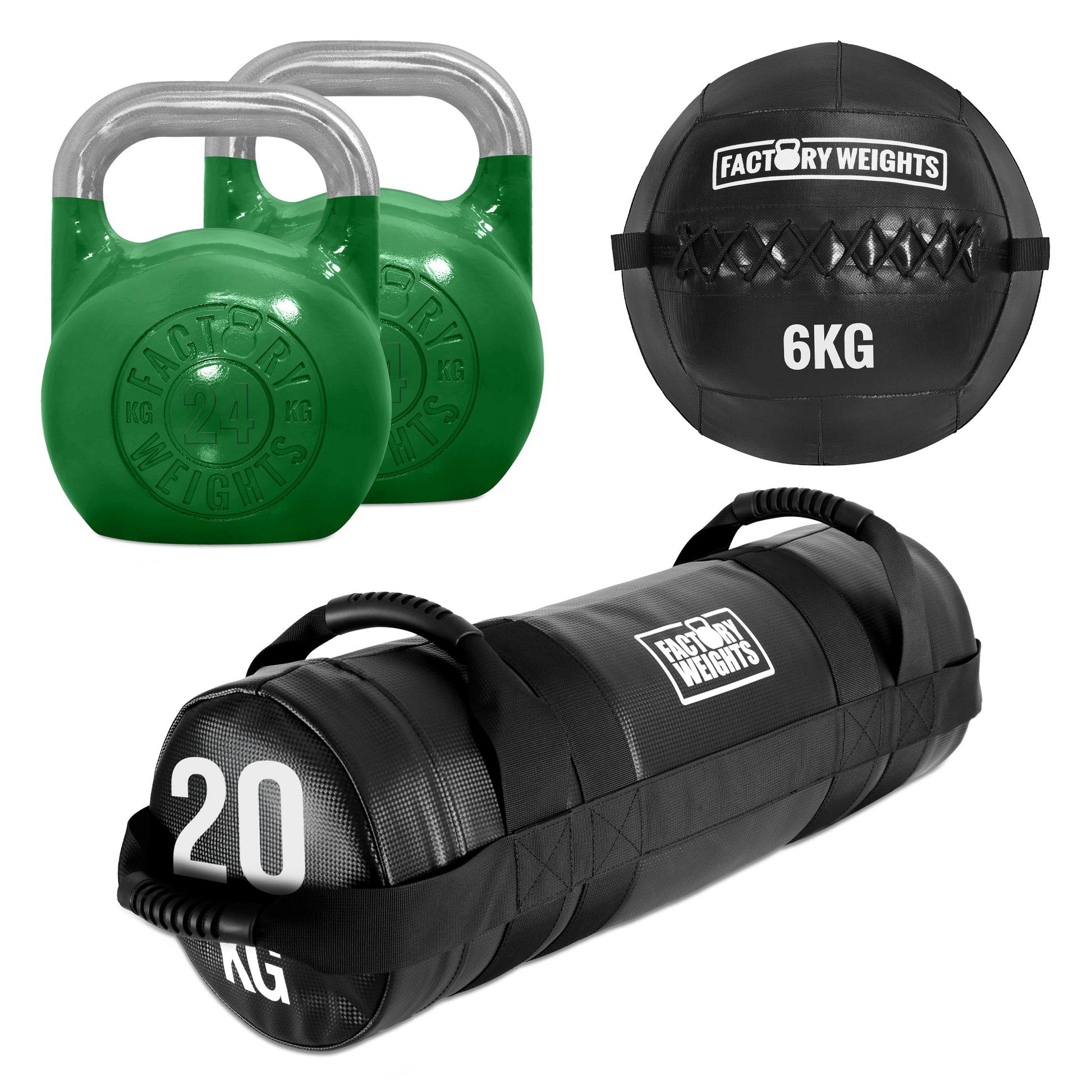 The Hybrid Training Package 2 delivers a comprehensive toolkit for functional fitness enthusiasts. This versatile set combines two kettlebells, a weighted sandbag, and a wall ball—each available in three progressive weight options that align with Hyrox competition standards. Whether you're conditioning for obstacle course racing or building well-rounded strength and power, this package eliminates the guesswork of equipment selection.